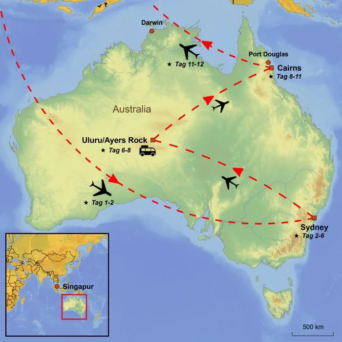 Freuen Sie sich auf einen Aufenthalt im wunderschönen Singapur, bevor es zu den großen Kontrasten in Australien weitergeht. In Down Under warten Melbourne, Sidney und die rote Wüste auf Sie, bevor Sie den Urlaub im tropischen Cairns beenden.