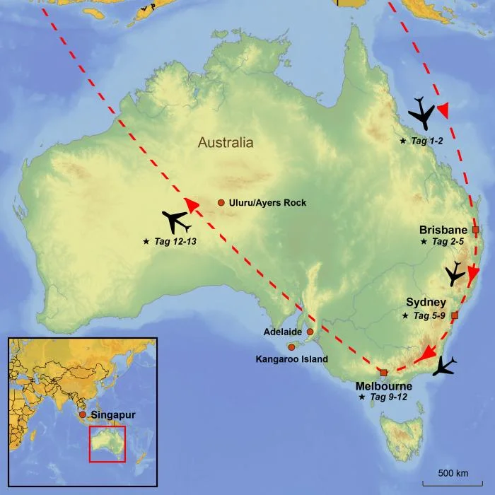 Heute reisen Sie vom ausgewählten Flughafen ab. Es geht mit Zwischenlandungen nach Australien.