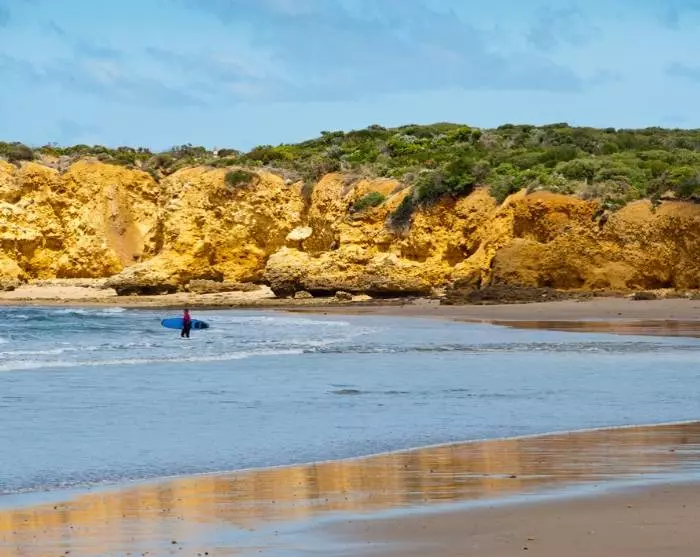 Von Lorne geht es auf der Great Ocean Road weiter durch Aireys Inlet, Anglesea und Torquay, vorbei an einer fantastischen Kombination aus grüner Vegetation, beeindruckender Küstenlandschaft und herrlichen Stränden, die zum Baden und Surfen einladen. Kurz vor Torquay befindet sich der Strand Bells Beach. Hier surfen die Profis. Jedes Jahr findet hier der prestigeträchtige Surfwettkampf Rip Curl Pro statt.