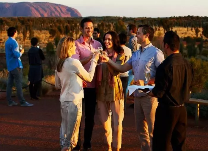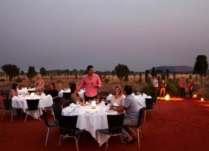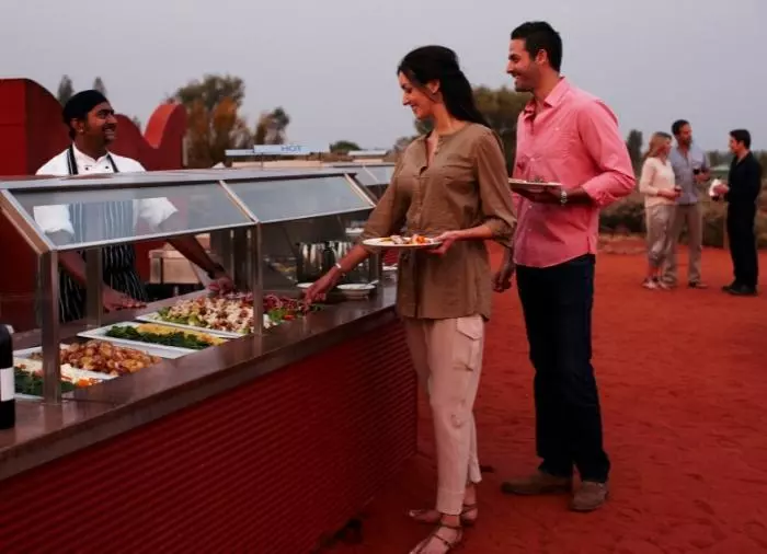 Genießen Sie das Abendessen unter dem Sternenhimmel im preisgekrönten Restaurant Sounds of Silence. Mitten in der australischen Wüste werden Sie mit einem edlen Gläschen empfangen. Im Hintergrund hören Sie ein Didgeridoo, während langsam die Sonne über Uluru untergeht. Wenn sich die Dunkelheit um sie schmiegt, serviert der Gastgeber ein leckeres, australisches BBQ, bei dem Sie interessante, australische Spezialitäten kosten können. Das Abendessen wird als Buffet serviert und an großen Tischen mit ca. 10 Gästen pro Tisch eingenommen. Danach erzählt ein Astronom mehr über den unendlichen Sternenhimmel über Ihnen.