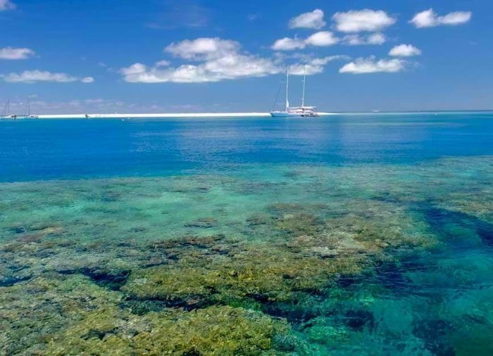 Bei dem Boot handelt es sich um einen gut 100 Fuß langen Luxus-Katamaran, welcher heute die Sandbänke des äußeren Riffs, Michaelmas Cay, ansteuert.