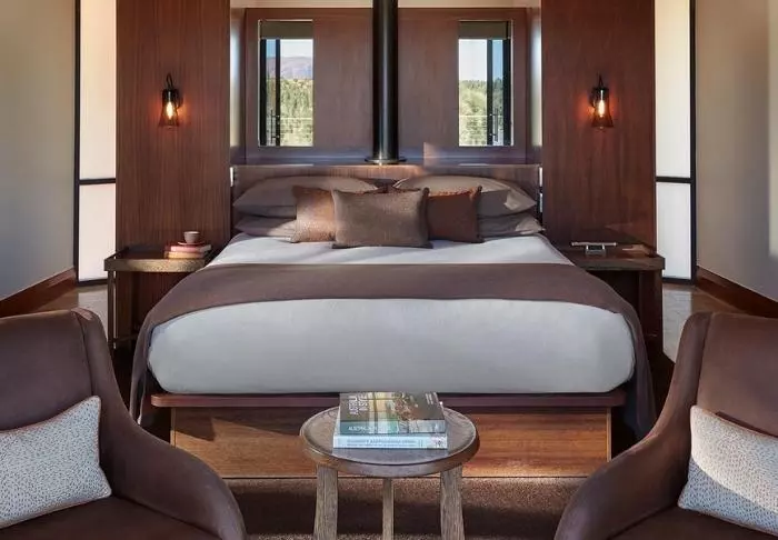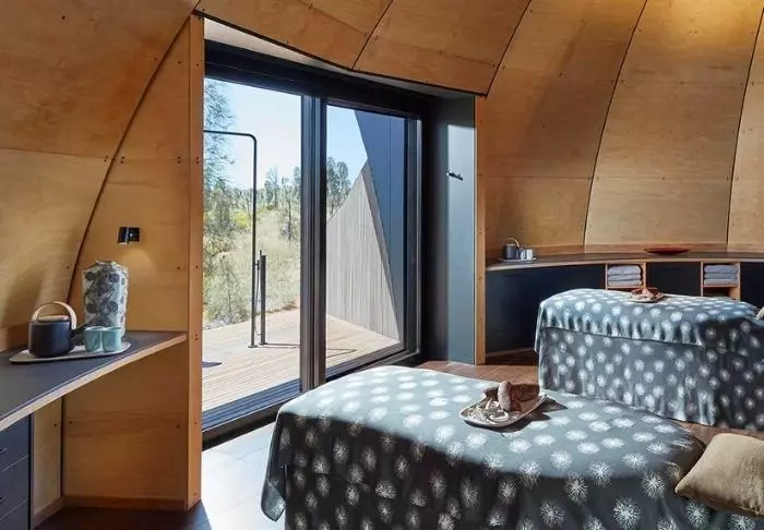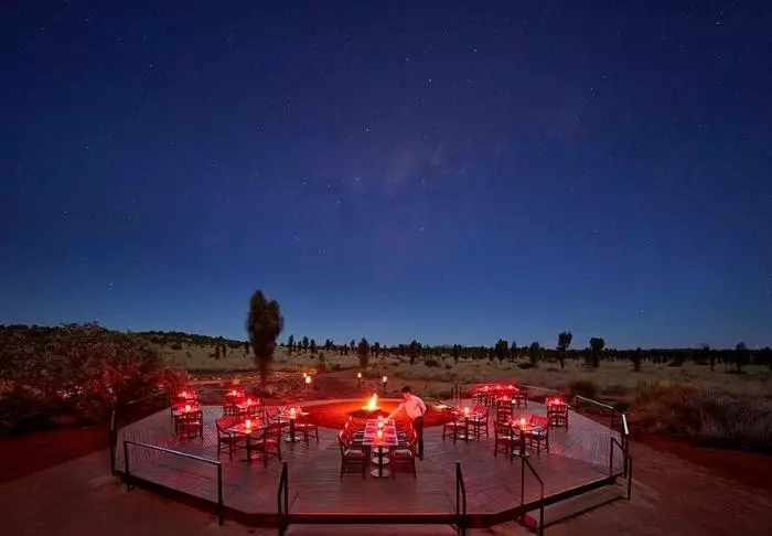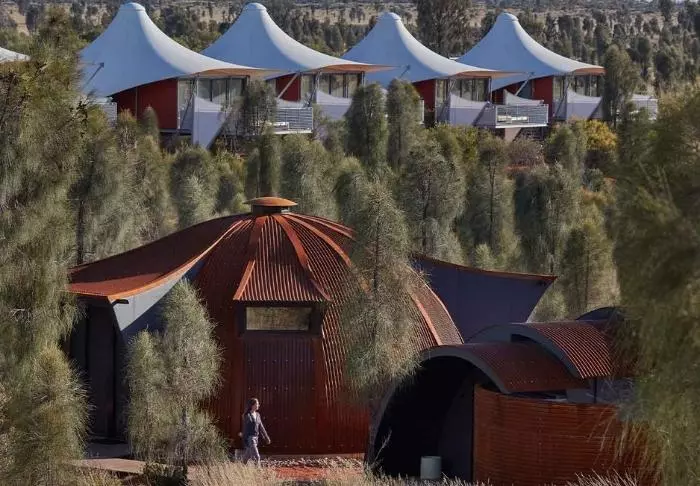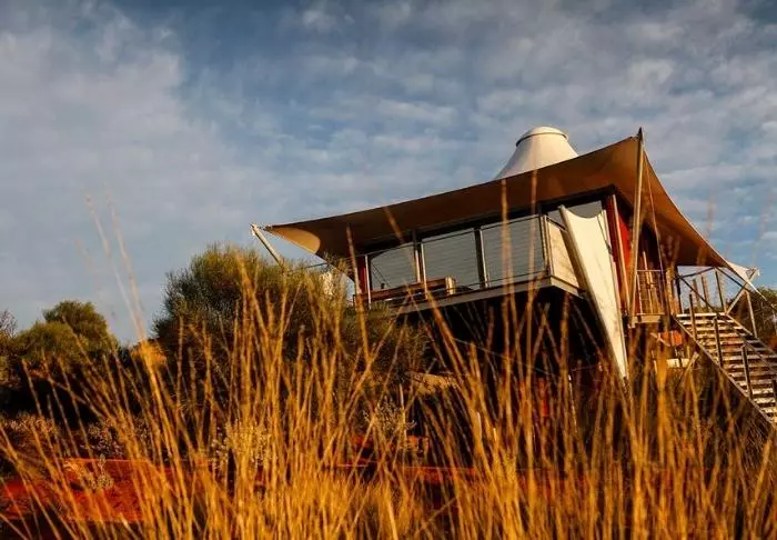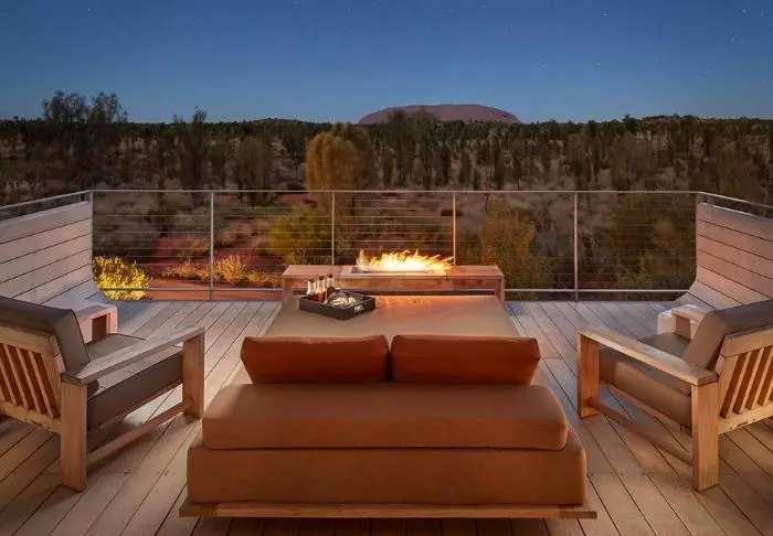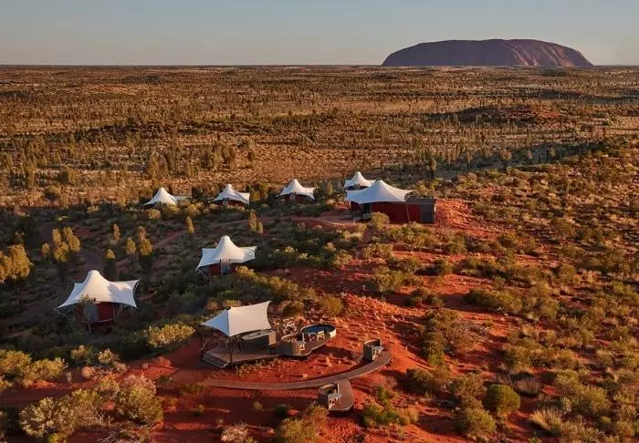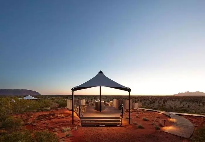 Zelt ist vielleicht nicht das richtige Wort. Die Fenster, die vom Boden bis zur Decke reichen, bieten einen ungestörten Blick auf Uluru, während das Dach aus Kanevas besteht. So riechen und hören Sie die Natur draußen. Diese Halbzelte sind geräumig und unglaublich geschmackvoll eingerichtet. Natürlich bieten sie auch alle erdenklichen Annehmlichkeiten wie ferngesteuerte Gardinen, sodass Sie morgens nicht einmal das Bett verlassen müssen, um zu sehen, ob die Sonne schon über Uluru aufgegangen ist. Alle 15 Zelte besitzen zudem eine große Veranda mit Strandbett, auf dem Sie dösen und die Aussicht auf den Monolithen genießen oder aber die Nacht unter dem Sternenhimmel verbringen können.