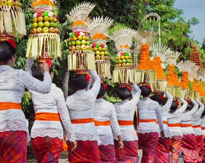 In den Tempeln und Straßen werden häufig zeremonielle Umzüge veranstaltet. Ein lustiges und stimmungsvolles Erlebnis! Die Balinesen sind in ihre herrliche traditionelle Kleidung gehüllt. Auf den Gehsteigen liegen kleine geflochtene Körbe aus Bananenblättern mit Opfergaben und Räucherstäbchen, die vor dem Bösen schützen sollen.