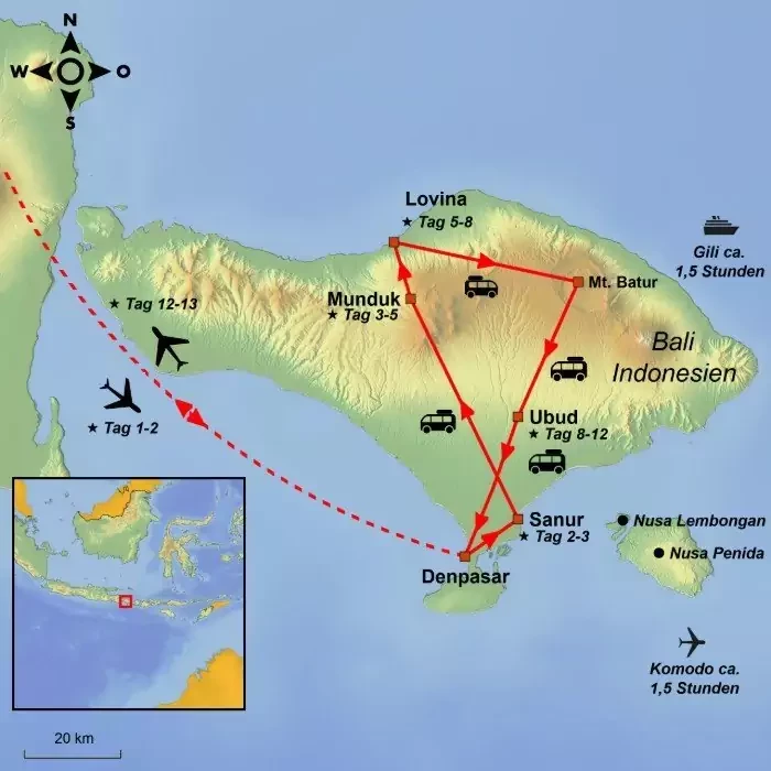 Die Reise beginnt mit einer Nacht in der Badestadt Sanur. Dort können Sie sich nach der langen Flugreise entspannen und an den Zeitunterschied gewöhnen, bevor Ihr Reiseprogramm beginnt.