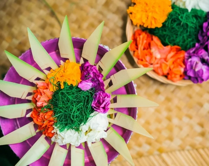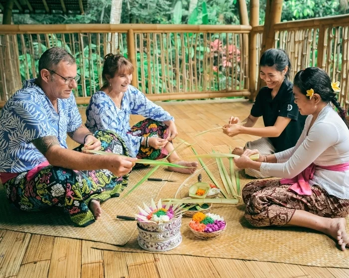 Die Erfahrung beginnt mit einer herzlichen Begrüßung durch einheimische Frauen aus dem Dorf Manggis, die Sie in das Handwerk der Herstellung traditioneller balinesischer Opfergaben einführen. Dabei erläutern sie die Symbolik jedes einzelnen Elements und zeigen, wie diese Opfergaben ganz selbstverständlich zum Alltag und zu den religiösen Ritualen auf Bali gehören. Es ist eine intime Begegnung mit den lokalen Traditionen und der Gemeinschaft, aus der sie hervorgehen.