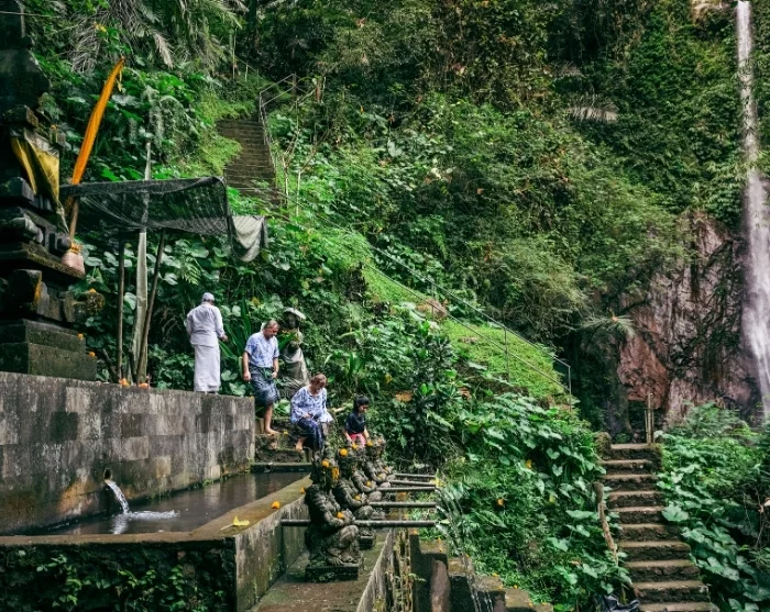 Anschließend geht es zum Jagasatru-Wasserfall. Sie werden zu einem nahe gelegenen Parkplatz gefahren; von dort sind es rund 300 Meter zu Fuß hinab zum Wasserfall. In der ruhigen, grünen Umgebung nehmen Sie an einer traditionellen Reinigungszeremonie teil; die Bewegung des Wassers und die Geräusche der Natur schaffen Raum für Ruhe und Besinnung. Die Zeremonie gibt Einblicke in balinesische spirituelle Praktiken und ihre tiefe Verbundenheit mit der Natur.