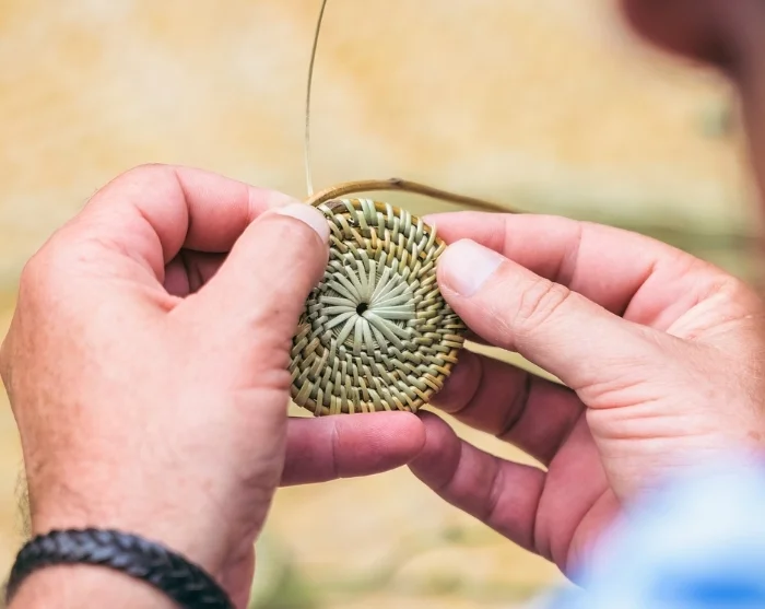 Gearbeitet wird mit Hata-Holz, einer lianenartigen und flexiblen Faser, die seit Jahrhunderten in der balinesischen Flechtkunst Verwendung findet. Mit geduldiger Anleitung lernen Sie, die Fasern vorzubereiten: schälen, trocknen und geschmeidig machen, bevor das eigentliche Flechten beginnt. Die ruhigen, sich wiederholenden Bewegungen erzeugen eine fast meditative Atmosphäre, in der sich Ihre Aufmerksamkeit ganz natürlich auf den Prozess richtet.