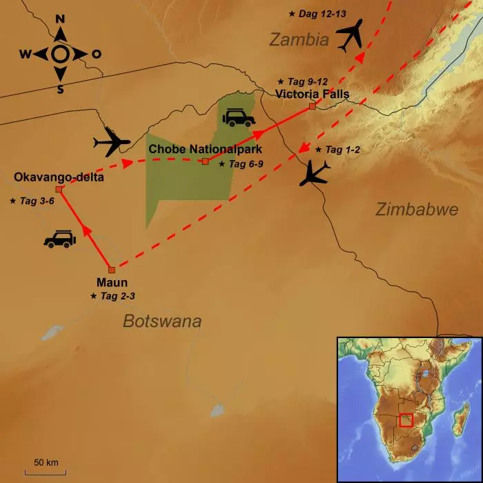 Heute reisen Sie an. Mit dem Flugzeug geht es mit Zwischenlandungen nach Botswana.