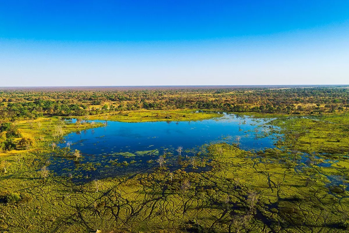 Die Landschaft in diesem Teil des Deltas ist sehr abwechslungsreich. Es gibt hohe Mopanenbäume, dichte Buschlandschaft und flache Gebiete, die manchmal von Wasser überschwemmt sind, manchmal aber auch wie trockene Wüsten mit toten, gespenstischen Bäumen aussehen. Und es gibt Flüsse, die hunderte an Flusspferden beherbergen.