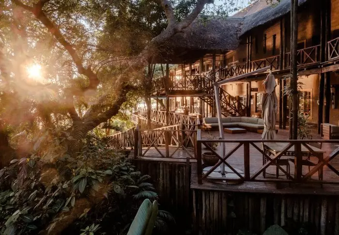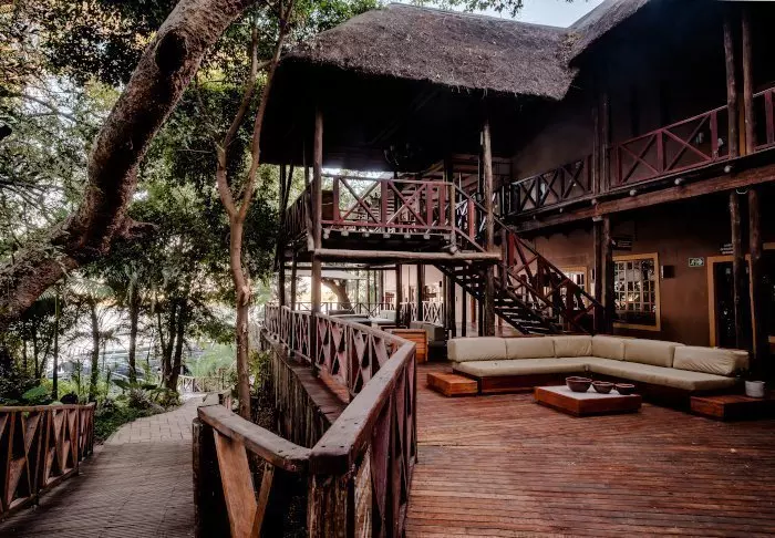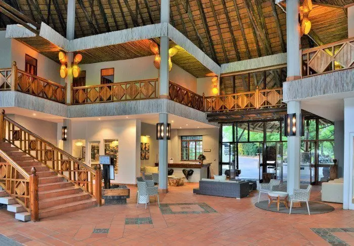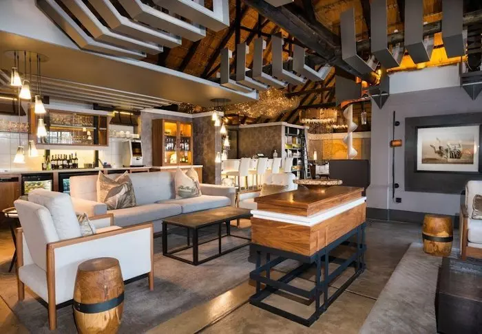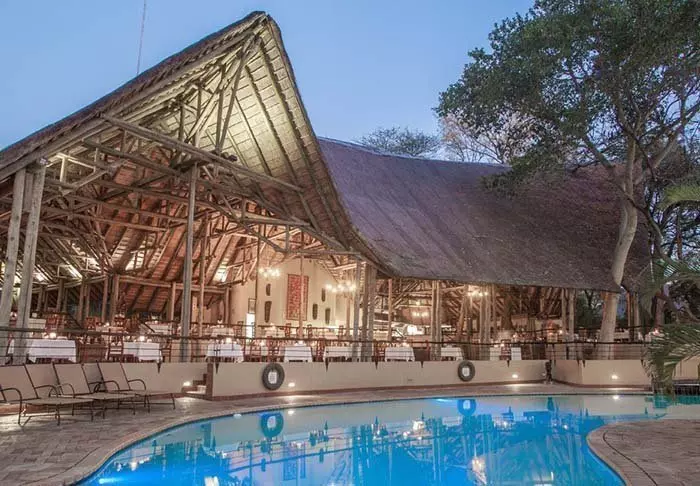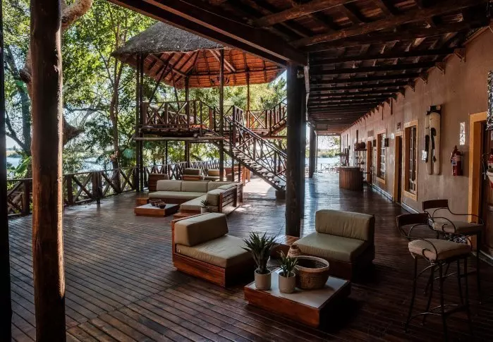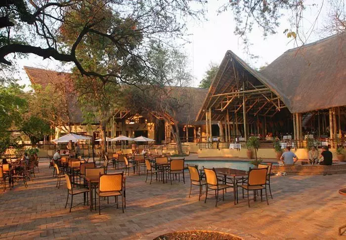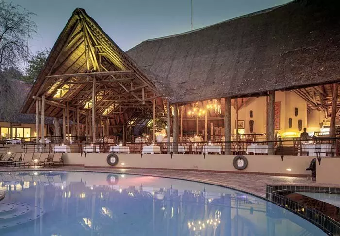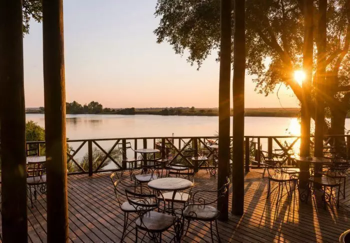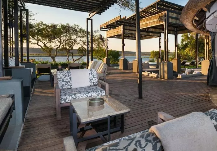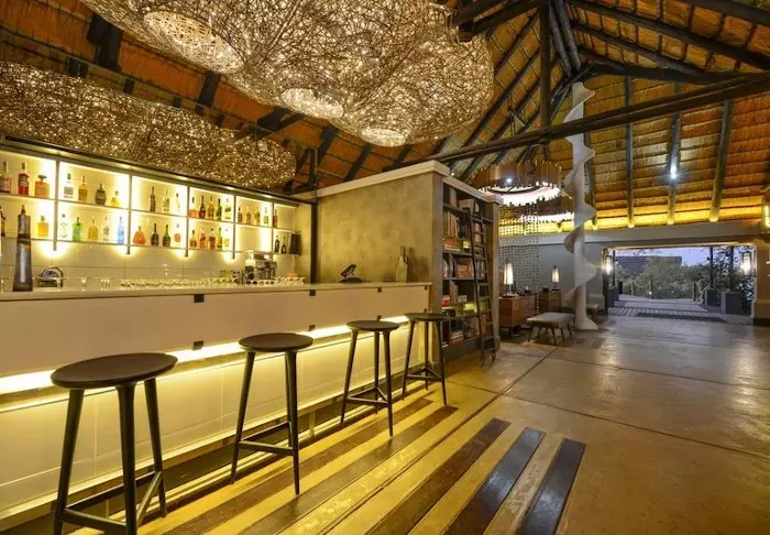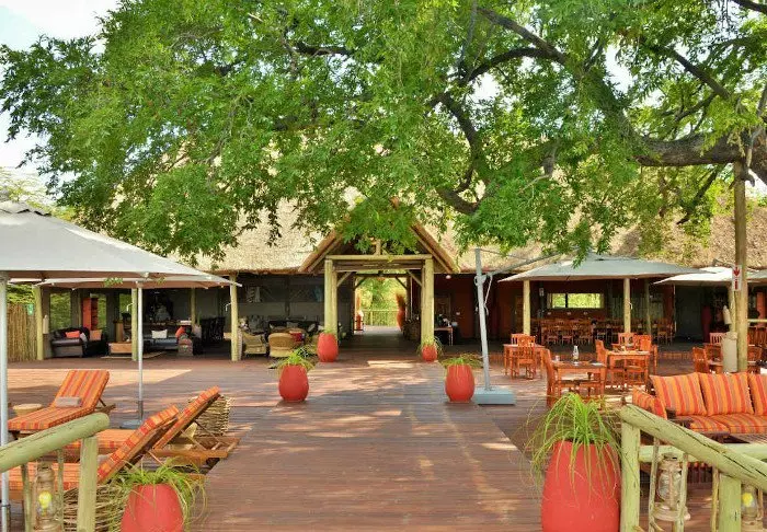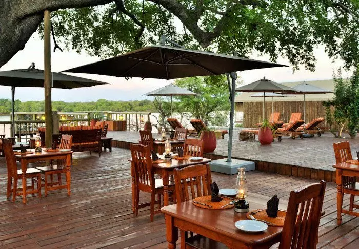 In der Lodge gibt es zwei Restaurants, einen Wellnessbereich und zwei Bars. Eine davon ist einfach perfekt für einen „Sundowner“ mit Aussicht auf den Fluss und die Sonne, die über dem Nationalpark untergeht.