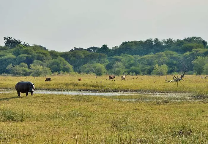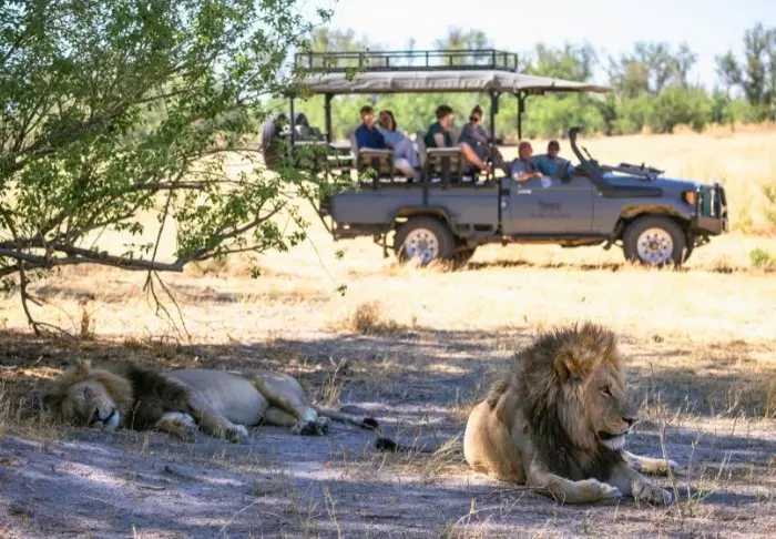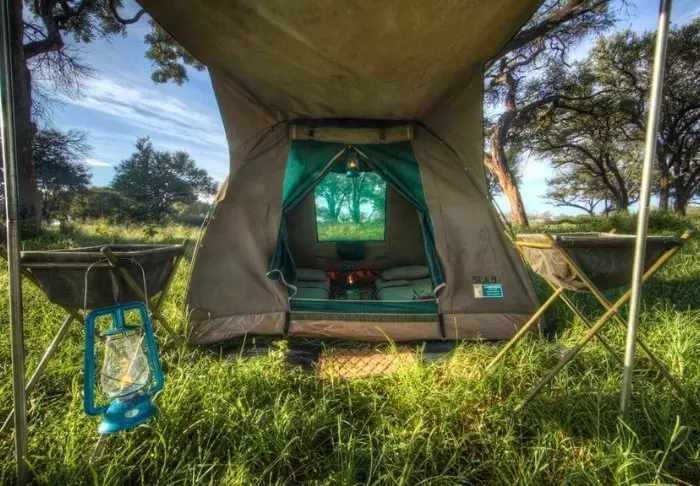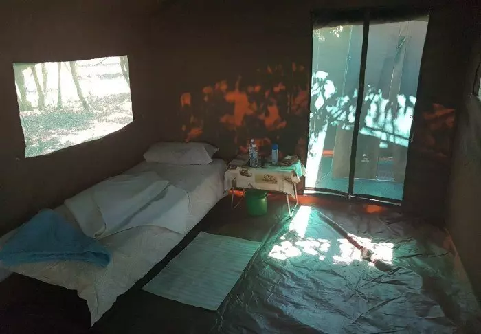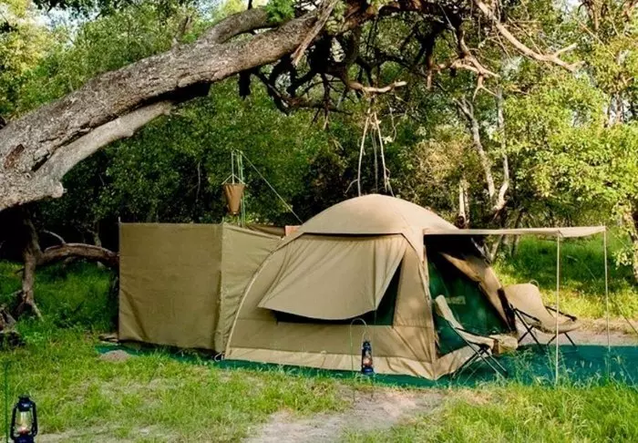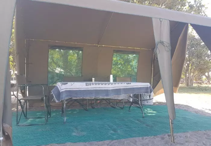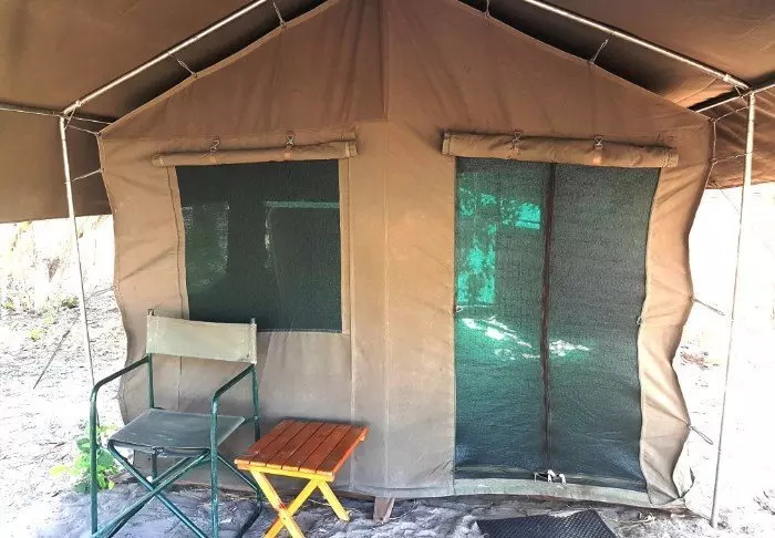 Das Zelt, in dem Sie übernachten, ist ca. 12 m² groß, aus starkem Kanevas und mit großen Fenstern. Sie können im Zelt stehen, es gibt Solarzellenlampen, eine Garderobe und natürlich Fliegengitter für alle Fenster und Türen. Vor dem Zelt ist ein kleines schattiges Vordach mit Tischen und Stühlen, sodass Sie die Aussicht auf die Natur um Sie genießen können. Sie übernachten in einem bequemen Feldbett mit einer herrlich weichen Matratze, richtigen Decken und Polstern sowie neben einem kleinen Nachttisch. Direkt neben dem Zelt befindet sich Ihr eigenes Busch-Badezimmer mit Dusche und Toilette. Im Zelt gibt es keine Elektrizität oder fließendes Wasser. Die Spülfunktion der Toilette besteht aus einem kleinen Häufchen Erde und einer Schaufel, aber es GIBT eine Toilette! Mehrmals am Tag wird Ihnen warmes Wasser angeboten, und Sie können sich in einem kleinen Becken waschen, das auf einem Stativ vor dem Zelt steht. Wenn Sie den Film „Jenseits von Afrika“ gesehen haben, wissen Sie genau, wie das funktioniert. Am Nachmittag wird Wasser erwärmt und in einem Eimer mit Duschkopf darunter nach oben gezogen, sodass Sie eine herrlich warme Dusche nehmen können. Das ist spartanisch, aber komfortabel. Vor allem aber übernachten Sie im Einklang mit der Natur. Sie hinterlassen keine Spuren, während Sie das Tierreich des Deltas hautnah erleben.