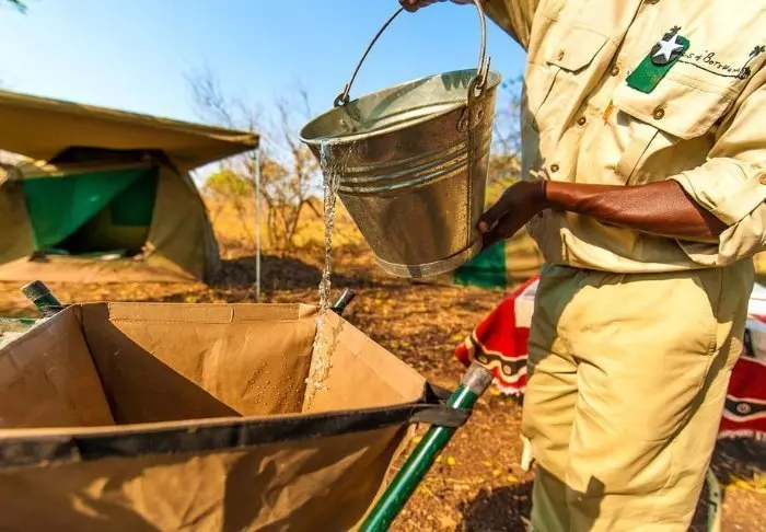 Außerhalb des Zeltes befindet sich ein kleines schattiges Vordach mit Stühlen, damit Sie den Blick auf die umgebende Natur genießen können. Sie schlafen auf einem bequemen Klappbett mit einer angenehm weichen Matratze, echten Bettdecken und Kissen sowie einem kleinen Nachttisch. In direkter Verlängerung Ihres Zeltes finden Sie ein eigenes Busch-Badezimmer mit Dusche und Toilette. Das Zelt hat weder Strom noch fließendes Wasser, und die Spülfunktion der Toilette besteht aus einem Haufen Erde und einer kleinen Schaufel – aber es GIBT eine Toilette! Mehrmals am Tag werden Sie mit heißem Wasser versorgt und können sich in einem kleinen Waschbecken waschen, das sich in einem Gestell außerhalb des Zeltes befindet. Wenn Sie den Film „Jenseits von Afrika“ gesehen haben, wissen Sie genau, wie alles funktioniert. Am Nachmittag wird Wasser erhitzt und in einen Eimer mit einem Duschkopf darunter geschöpft, sodass Sie eine schöne heiße Dusche haben. Es ist primitiv, aber komfortabel und vor allem: Es ist eine Übernachtung im Sinne der Natur, bei der Sie keine Spuren hinterlassen, während Sie die Tierwelt des Deltas aus nächster Nähe erleben.