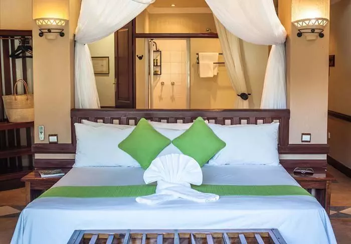 Die Zimmer sind geräumig, modern eingerichtet und verfügen alle über Moskitonetze über den Betten, Klimaanlage und eine Kaffee- /und Teeecke, in der man selbst ein Heißgetränk zubereiten kann.