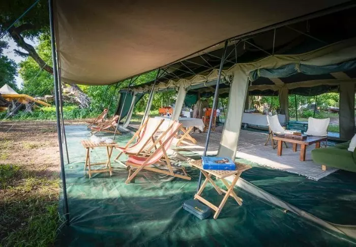 In den beiden Camps, die zwar in unmittelbarer Nähe voneinander liegen, aber trotzdem unabhängig voneinander funktionieren, warten insgesamt 14 herrliche Zelte auf Sie. Es handelt sich um klassische Safarizelte, allerdings mit (Solar-)Elektrizität, einem eigenen Badezimmer und einer eigenen Outdoor-Dusche mit warmem Wasser. Von Ihrem Zelt aus haben Sie eine wunderschöne Aussicht auf den Fluss oder die offene Savanne. Mit ein wenig Glück sehen Sie im Laufe des Tages viele Tiere vorbeilaufen. Die Mahlzeiten werden im gemütlichen Messezelt oder unter freiem Himmel eingenommen. Nachts werden Sie sicher durch Tierlaute wach, die direkt durch die Kanevaswände in Ihr Zelt dringen.