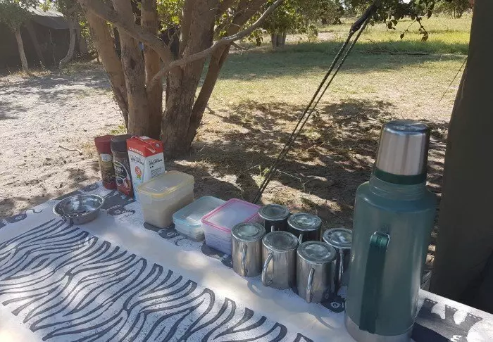 Die Mahlzeiten werden im Messezelt eingenommen und schmecken herrlich! Frisch zubereitet, lecker und sättigend. Bei Safaris wird man nämlich unglaublich hungrig. Natürlich gibt es auch kaltes Bier und Wein zum Essen, wenn Sie möchten. Den ganzen Tag stehen außerdem Tee und Kaffee in einer Kanne zur Verfügung.