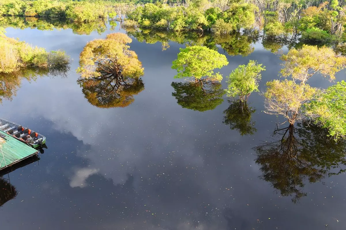 Der Tag beginnt früh mit einem rund 4-stündigen Transfer zu Ihrer Dschungel-Lodge, in der Sie die nächsten 3 Nächte verbringen. Sie werden zum Hafen gebracht, von wo aus Sie mit dem Schiff zur kleinen Stadt Villa do Careiro fahren. Von dort werden Sie zum Fluss Tupana gebracht und fahren das letzte Stück mit dem Boot zur Lodge. Und der Transport ist nicht einfach nur ein Transport zur Lodge, sondern der Anfang Ihres Amazonas-Abenteuers. Sie erleben u. a. den Ort, an dem die beiden großen Flüsse Rio Negro und Rio Solimões zusammenfließen und zum Amazonas werden. Der eine Fluss ist braun und schlammig, während der andere schwarz ist. Die Trennlinie zwischen den beiden Flüssen ist deutlich erkennbar. Dieses fantastische Phänomen wird auch „Treffen der Wasser“ genannt.