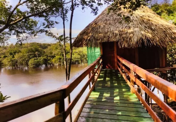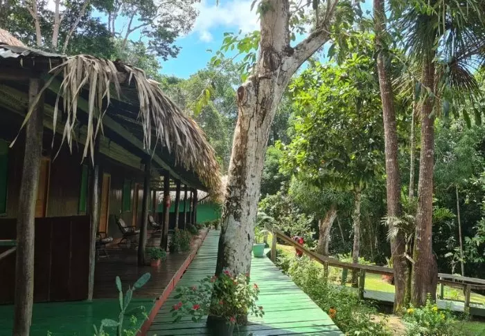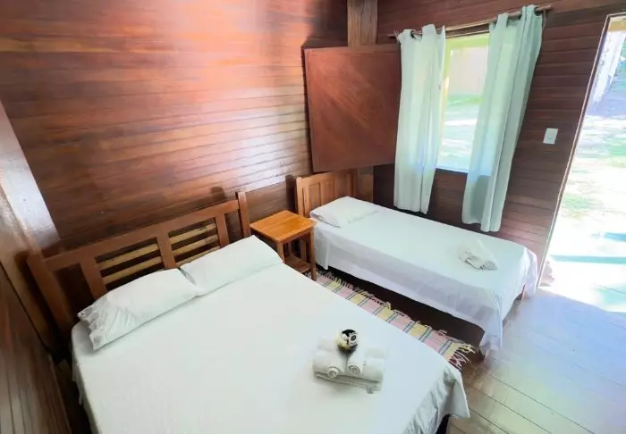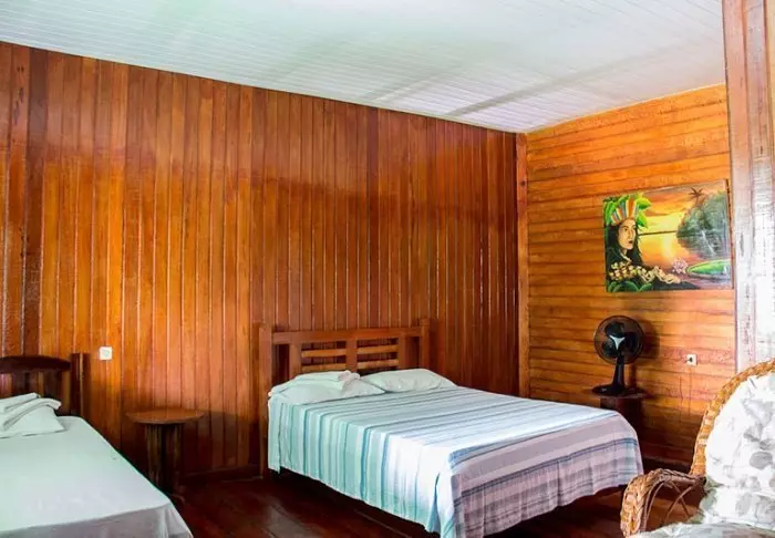 Bei der Ankunft in der Lodge erhalten Sie ein erfrischendes Begrüßungsgetränk und beziehen Ihr Zimmer. Die Lodge verfügt über nur 18 rustikale Zimmer, und die Atmosphäre ist gemütlich und einladend. Die Räume sind aus Holz aus der Gegend gebaut, das gut mit der umgebenden Natur harmoniert. Die Zimmer sind einfach möbliert, aber schön sauber und bieten alles, was Sie brauchen: ein Bett, einen Deckenventilator und ein Bad mit natürlich aufgewärmtem Wasser. Darüber hinaus sind die Fenster mit Moskitonetzen ausgestattet, obwohl der hohe pH-Wert im Fluss Tupana es den Stechmücken erschwert, sich zu vermehren. Daher sind Stechmücken hier den größten Teil des Jahres über kein Problem.