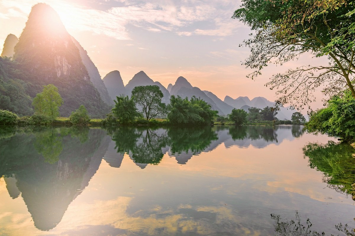 Yangshuo liegt in einer fast poetischen, einfach atemberaubenden Landschaft. Der Fluss Li verläuft zwischen den hohen Kalksteinbergen, die wie stolze Buckel aus der Landschaft aufragen. Etwas außerhalb der Stadt können Sie die fleißigen einheimischen Bauern beobachten, die Reis-, Gemüse- und Blumenfelder bewirtschaften.