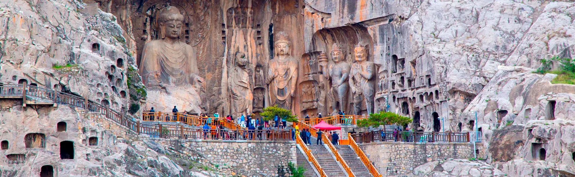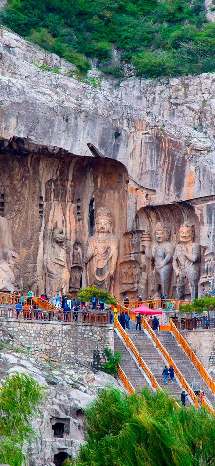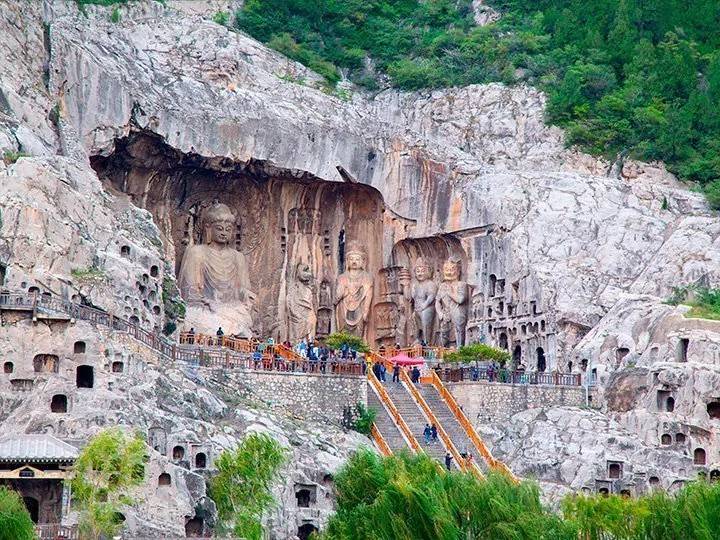 Sie besuchen die wichtigsten Grotten, darunter die Ahnen-Grotte, die von 672-675 während der Tang-Dynastie entstand. Die Ahnen-Grotte ist die größte und beeindruckendste Grotte von allen. Hier befindet sich der 17 Meter hohe Buddha mit seinen 2 Meter langen Ohrläppchen. Normalerweise sind Buddhas maskulin, aber das Gesicht dieses Vairocana-Buddhas (Losana) ist sehr feminin. Es handelt sich angeblich um die Kaiserin Wu Zetian aus der Tang-Dynastie. Die Buddha-Figur ist umgeben von den Schülern Ananda und Mahakasyapa sowie zwei Bodhisattvas.