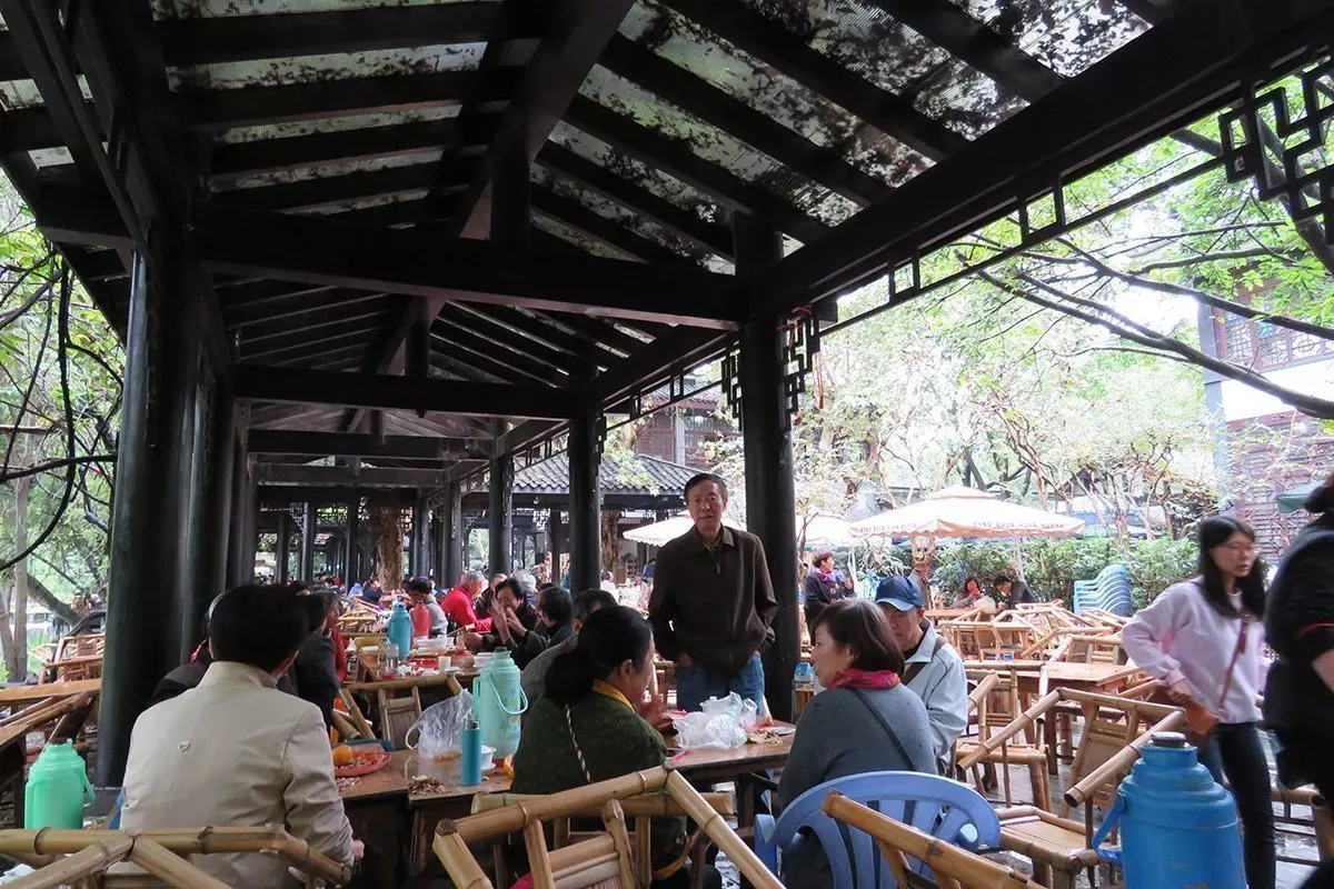 Es gibt keine bessere Art, um die Chinesen hautnah zu erleben, als in einem der gemütlichen Teehäuser von Chengdu zu sitzen, z. B. im Volkspark. Der Volkspark wurde 1911 als erster öffentlicher Park von Chengdu angelegt und gehört heute zu den schönsten Volksparks in China. Setzen Sie sich an einen Tisch im Teehaus Heming, das am Ufer des Sees im Park liegt. Bestellen Sie eine Tasse Tee und genießen Sie einfach die Atmosphäre. Es wird viel geplaudert. Die Mahjong-Steine werden auf den Tischen herumjongliert, während eine leere Tasse schnell und häufig mit dem besten Tee des Hauses aufgefüllt wird. Einige lassen sich sogar von einem professionellen Ohrenreiniger, der mit einer Stirnlampe, Pinzetten, Zangen und Bürsten aus Gänsefedern ausgestattet ist, die Ohren säubern. Ja, willkommen in Chengdu!
