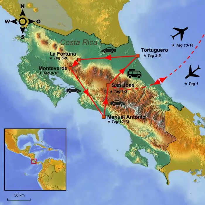 Costa Rica ist mit seinen langen Sandstränden, grünen Regenwäldern, kegelförmigen Vulkanen, heißen Quellen und mystischen Nebelregenwäldern ein wahres Paradies für Natur- und Tierfreunde. Bei dieser Reise können Sie die Freiheit eines eigenen Mietwagens sowie alle Costa-Rica-Höhepunkte erleben.
