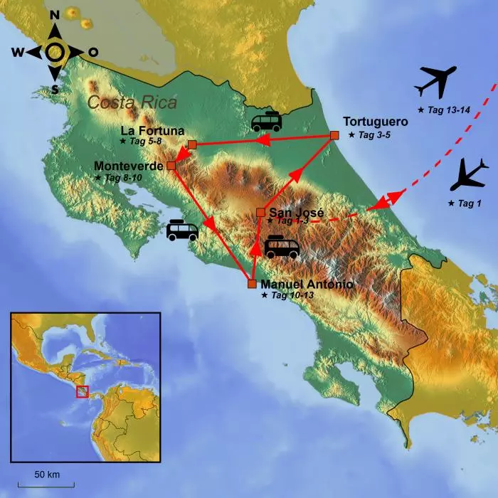Die Reise beginnt in der Hauptstadt Costa Ricas, San José. Von dort geht es zum grünen Dschungel des Nationalparks Tortuguero. Sie sind umgeben von wunderschöner Natur und einem aufregenden Tierreich. Der gesamte Transport erfolgt hier im Boot auf den vielen Kanälen von Tortuguero.
