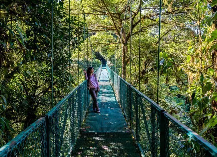 Heute erleben Sie den Nebelregenwald Monteverde von oben. Eine adrenalingeladene 2,5 Kilometer lange Wanderung über Hängebrücken in den Baumkronen wartet auf Sie. Hier oben spüren Sie eine ganz besondere mystische Stimmung, die durch den Nebel entsteht. Sie befinden sich in einer abenteuerlichen Landschaft, umgeben von Bäumen, Farnen, Orchideen, Moos und unzähligen Pflanzenarten, die an den Baumstämmen wachsen.
