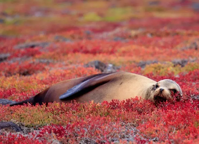 Auf South Plaza sehen Sie überall Feigenkaktusse und die Pflanze Sesuvium edmonstonei, die es nur auf Galapagos gibt. Die Insel ist auch das Zuhause der Riesenechsen. Vielleicht entdecken Sie einen, die im Schatten eines Feigenkaktusses darauf wartet, dass eine Frucht zu Boden fällt. Am Wasser können Sie viele Seelöwen und Seevögel wie Gabelschwanzmöwen und Rotschnabel-Tropikvögel erleben.