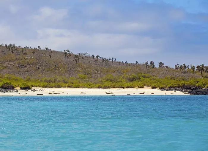Santa Fé: liegt südöstlich von Santa Cruz. Von Puerto Ayora fahren Sie ca. 1,5 Stunden mit dem Boot zur Insel. Dort werden Sie von einer großen Seelöwenkolonie empfangen, welche sich am weißen Sandstrand aufhält.
