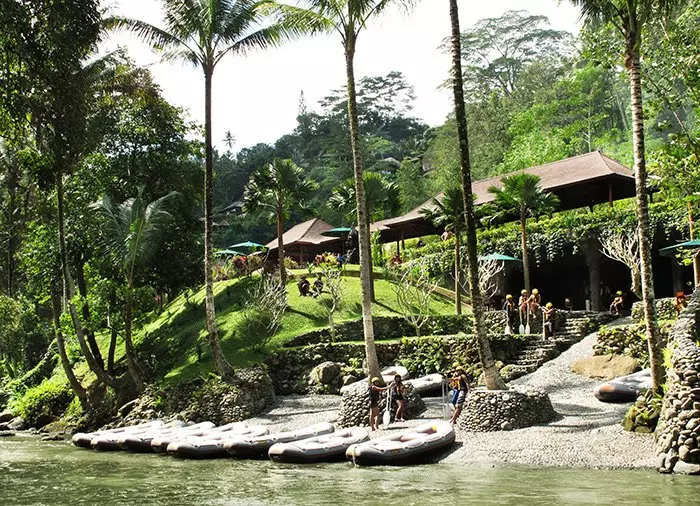Ein steiler Weg und Stufen führen zum Fluss Ayung hinunter. Dort erhalten Sie Anweisungen fürs Rafting und das Verhalten im Boot, in dem 6 Personen und ein zertifizierter Guide Platz haben. An Bord befindet sich eine wasserdichte Tasche, in der Sie Ihr Mobiltelefon, Geld usw. aufbewahren können.