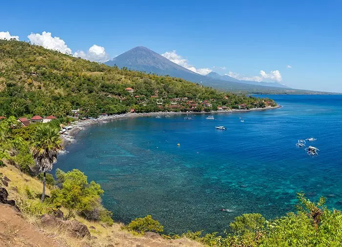 Sie werden vom Hotel abgeholt und zur kleinen Bucht Jemeluk gefahren, wo im Hintergrund der Mount Agung aufragt. Jemeluk ist eine der allerbesten Schnorchelstellen in diesem Gebiet. Das Wasser ist Dank der Halbmondform der Bucht ruhig.