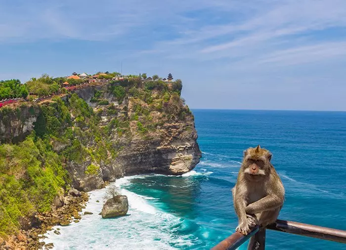 Sie werden am Nachmittag von Ihrem Hotel abgeholt und zu einem der berühmtesten Tempel Balls gefahren, Pura Luhur Uluwatu, welcher auf einer Klippe, 76 m über dem Meer liegt. Hier hat man eine fantastische Aussicht auf den Indischen Ozean. Spüren Sie den Adrenalinrausch, wenn Sie ganz oben an der Mauer stehen und in das tosende schäumende Meer, das gegen die Felsen klatscht, hinunterblicken. Durch archäologische Funde konnte der Tempel mit dem 10. Jahrhundert datiert werden. Dieser Ort ist gleichzeitig einer der schönsten Plätze auf Bali, um den Sonnenuntergang zu genießen. In den Bäumen am Eingang zum Tempel leben verspielte Affen. Es wird erzählt, dass diese den Tempel vor dem Schlechten und Bösen beschützen.