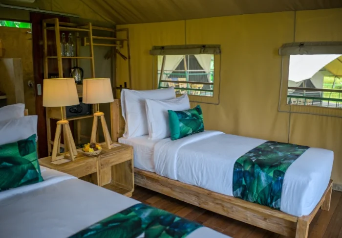 Es gibt Zimmer in 4 verschiedenen Ausführungen, wobei jedoch alle mit Badezimmer, Ventilator, Moskitonetz, Balkon oder Terrasse ausgestattet sind. Hier kann man es sich nach einem ereignisreichen Tag im Nationalpark wohl sein lassen und den Stimmen im Urwald lauschen. Die Einrichtung der Zimmer und der Anlage insgesamt ist einfach aber gut. Das im Restaurant verarbeitete Bio-Gemüse stammt aus eigenem Anbau.
