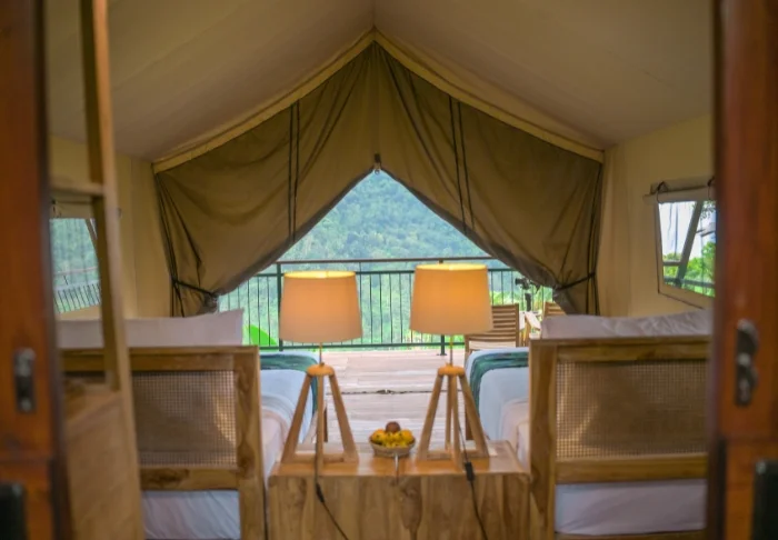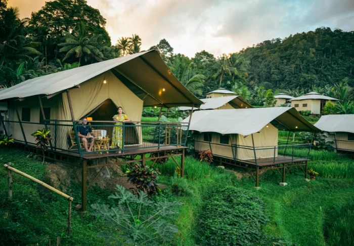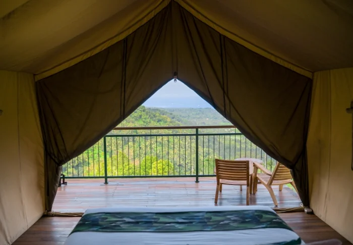 Die Anlage besteht aus 22 freistehenden Pavillons, die auf kleinen Terrassen liegen und entweder ins Tal oder auf das Meer blicken. Die Innenräume sind hell und schlicht, geprägt von natürlichen Materialien wie Holz und gewebten Stoffen. Ziehen Sie die Plane zur Seite, und der Raum öffnet sich zur Natur; treten Sie direkt auf Ihre eigene Terrasse und fühlen Sie sich ganz in die Landschaft eingebettet. Standardmäßig wohnen Sie in einem Pavillon für zwei Personen mit 25 m² Innenfläche und einer 10 m² großen Terrasse. Alle Pavillons verfügen über Klimaanlage, WLAN, einen Safe sowie ein Bad mit Toilette, Dusche, Warmwasser und lokal hergestellten Pflegeprodukten.