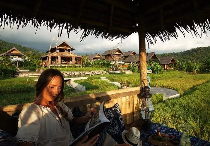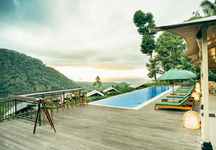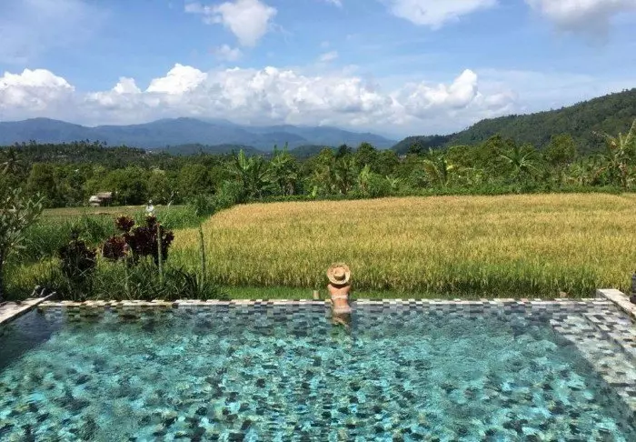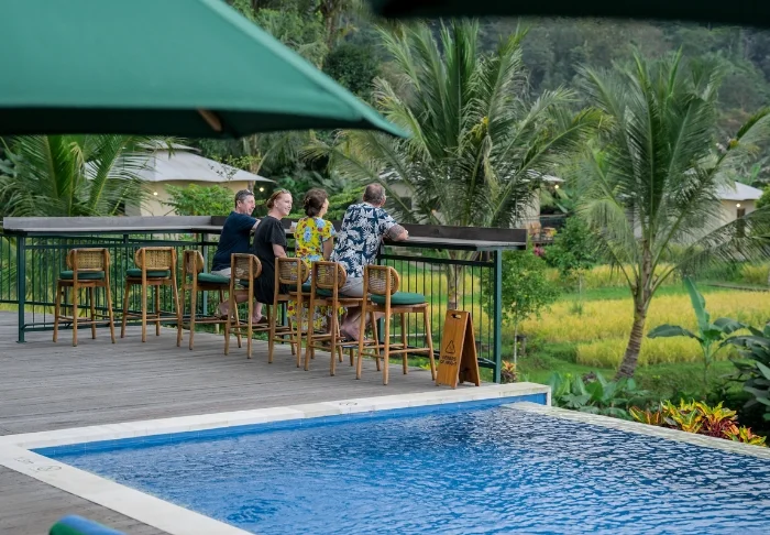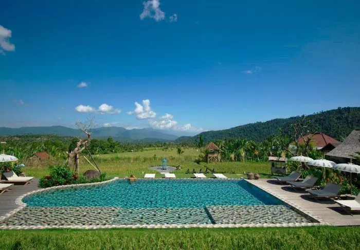 Im Hotel gibt es eine herrliche Sonnenterrasse mit Liegestühlen, Pool und einem kleinen Kinderbecken. Dort können Sie sich entspannen und neue Energie tanken, während Sie die Aussicht auf die Reisfelder, die hohen Palmen, tropischen Bäume und Pflanzen bewundern.