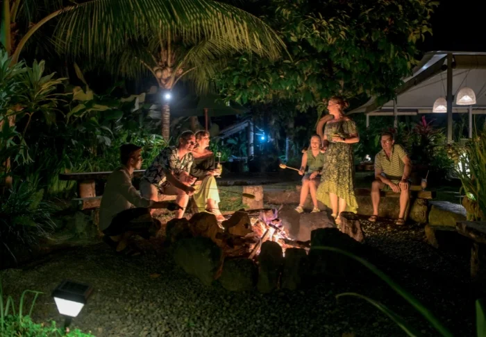 Abends stellt sich oft eine ungezwungene Atmosphäre an der offenen Feuerstelle ein, mit einem erfrischenden Cocktail in der Hand, während das Zirpen der Zikaden und der Schein der Flammen den Ton für den restlichen Abend angeben.