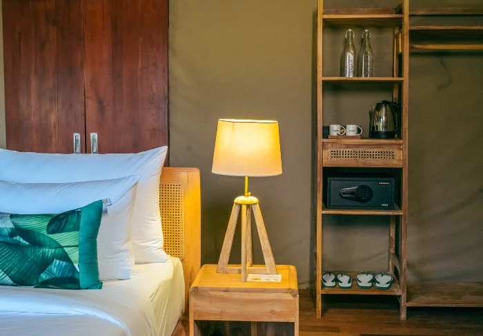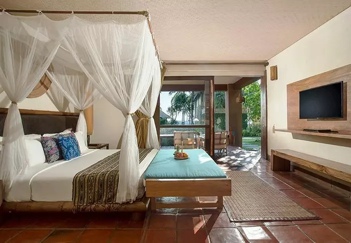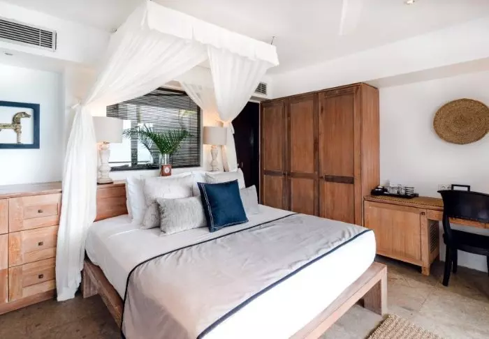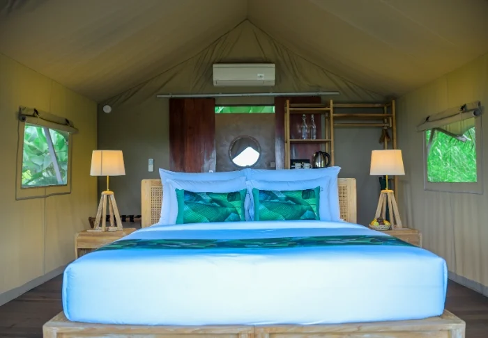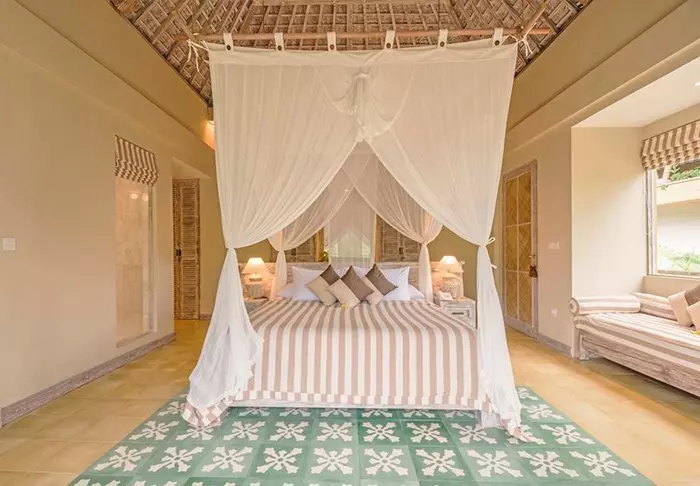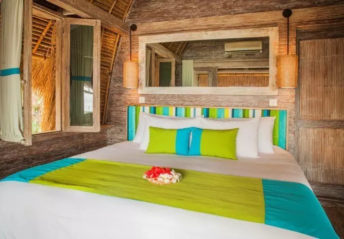 Das Hotel besteht aus 18 eigenständigen Bungalows, die in tropischem Stil aus nachhaltigen Naturmaterialien errichtet worden sind. Sämtliche Bungalows sind mit elegantem Himmelbett mit Moskitonetz, WLAN, Klimaanlage, Minibar, Tee-/Kaffee-Ecke sowie mit einem teilweise offenen Badezimmer mit Dusche, Badewanne und Föhn ausgestattet. Auf der Veranda können Sie sich mit einem guten Buch entspannen und die sanfte Brise genießen.