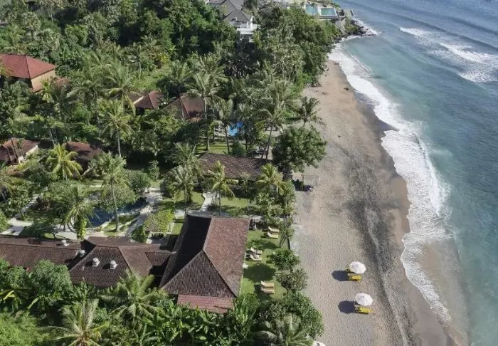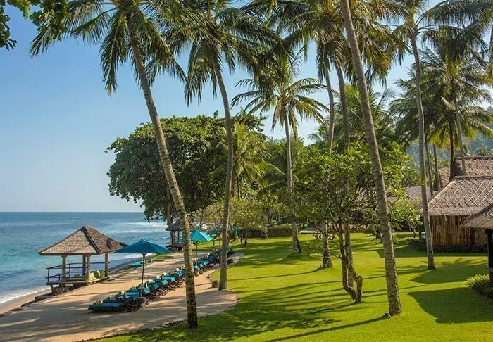 Das Resort liegt direkt an einem wunderschönen Strand, der zur Entspannung einlädt. Der Strand besticht durch weichen, goldenen Sand und ruhiges, klares Wasser, das sich hervorragend für ein Bad oder zum Schnorcheln eignet. Die umgebenden Palmen und der Blick aufs Meer schaffen eine tropische und ruhige Atmosphäre, in der Sie entweder die Sonnenstrahlen genießen oder im Schatten eines Sonnenschirms entspannen können. Der Strand ist zudem ein idealer Ort, um die magischen Sonnenuntergänge über der Lombokstraße zu erleben, die den Himmel in warme Farben tauchen.