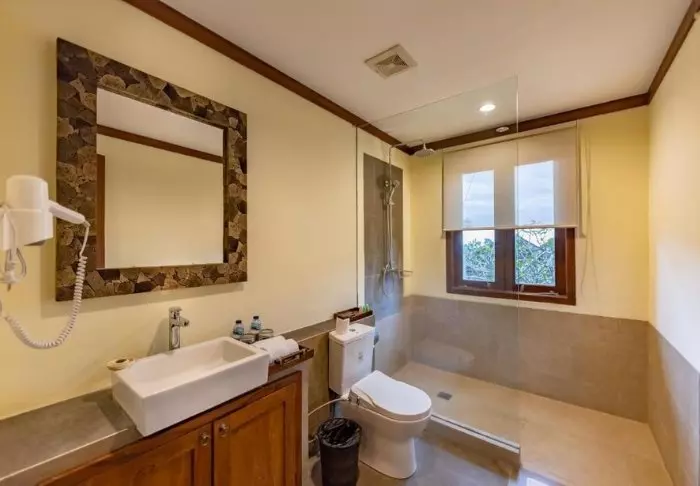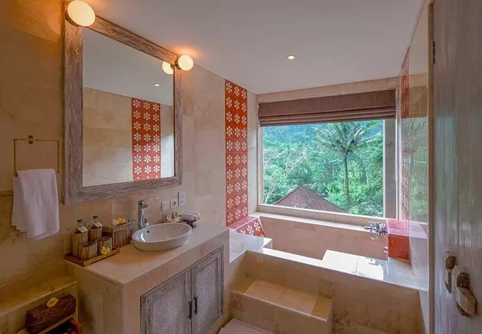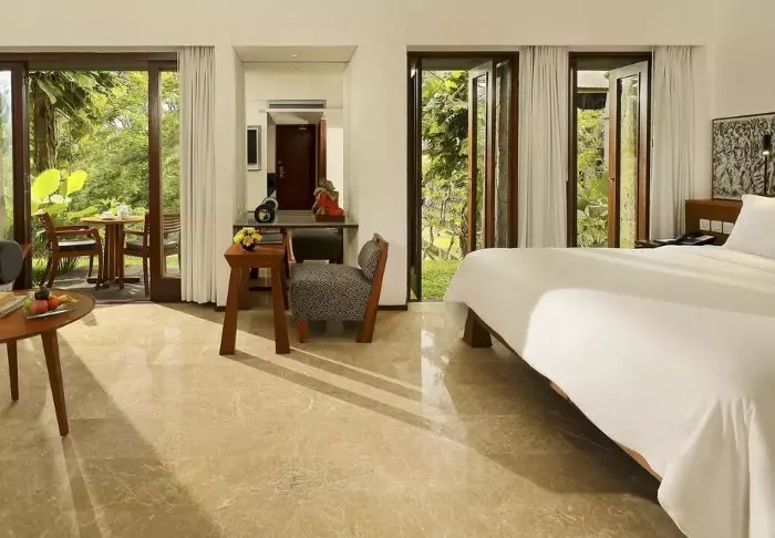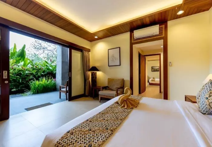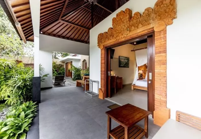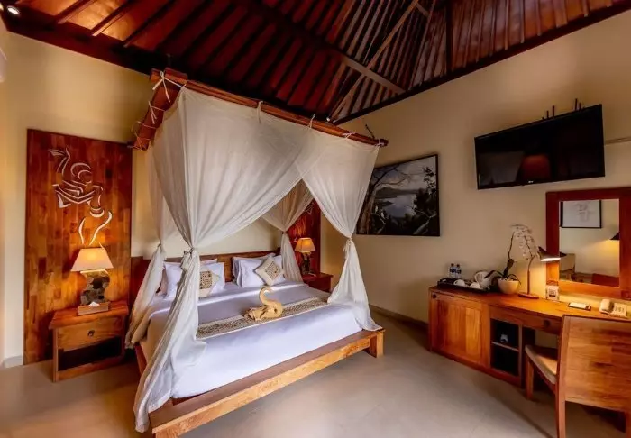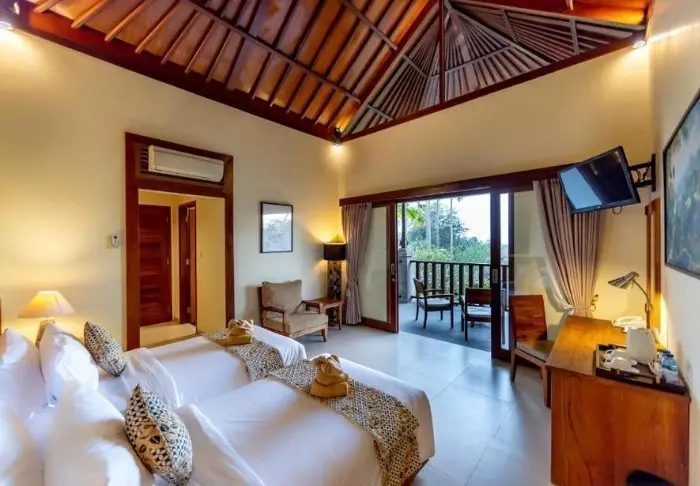 Die Unterbringung im Anumana Village Ubud ist modern, in wunderschön balinesischem Stil. Die Zimmer sind geräumig (46 m²) und besitzen einen eigenen Balkon oder eine Terrasse, von wo aus Sie den grünen Garten genießen können. In den Zimmern gibt es überall gratis WLAN, eine Klimaanlage, eine Minibar und eine Tee- und Kaffee-Ecke. Die Badezimmer sind mit kostenlosen Toilettenartikeln und einem Föhn ausgestattet. Täglich wird eine Flasche Wasser kostenlos zur Verfügung gestellt.