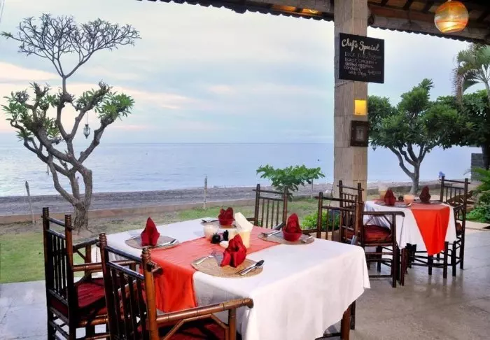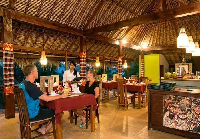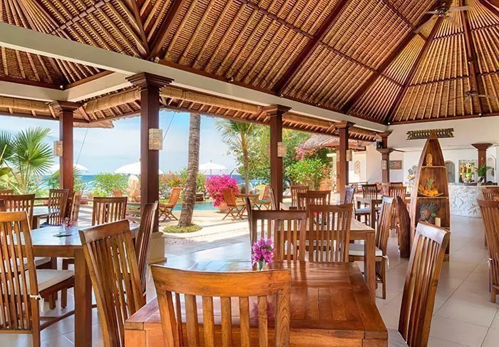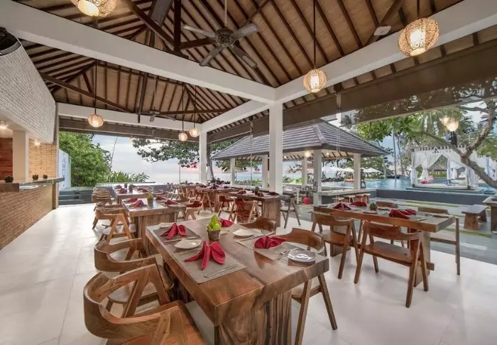 Im Restaurant wartet das Küchenteam, bestehend aus Einheimischen aus einem nahe gelegenen Dorf, darauf, balinesische und indonesische Gerichte aus regionalen Zutaten sowie frischen Fisch von regionalen Fischern zu servieren. Dort weht außerdem eine herrliche Meeresbrise, die Aussicht auf den Strand.