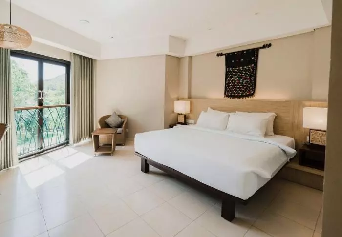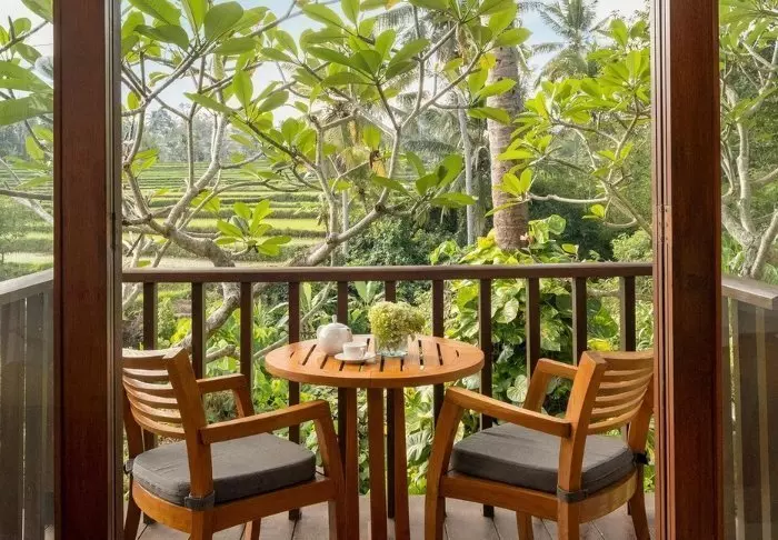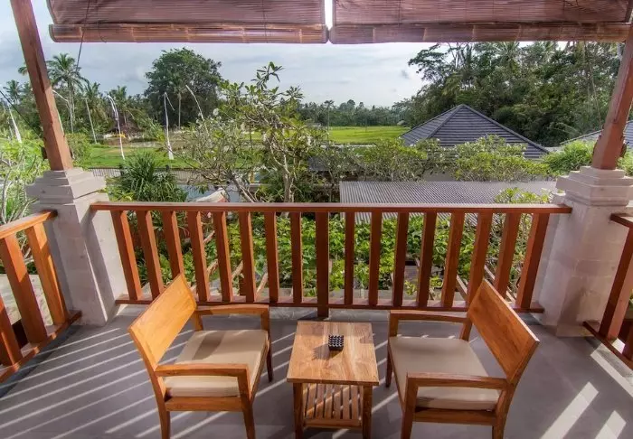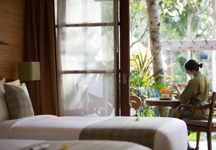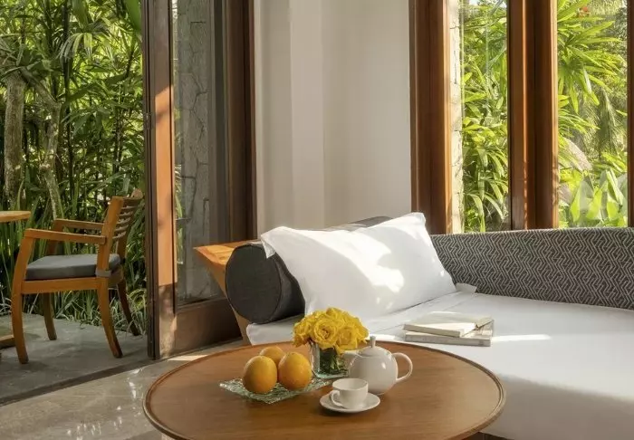 Die Zimmer sind geräumig und schön in hellen Naturmaterialien eingerichtet. Sie besitzen einen eigenen Balkon, welcher in Richtung Berge, Reisfelder und Fluss liegt. Alle Zimmer sind mit WLAN, Klimaanlage, Minibar, Safe, Tee-/Kaffee-Ecke sowie Moskitonetz über dem Bett ausgestattet. Das Badezimmer besitzt eine eigene Badewanne und ist außerdem mit Bademantel, Badeschuhen, Toilettartikeln und Föhn ausgestattet. Um Ihren Aufenthalt besonders angenehm zu gestalten, werden täglich 2 kostenlose Flaschen mit Wasser und frisches tropisches Obst serviert.