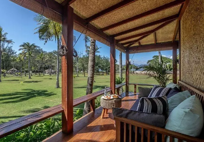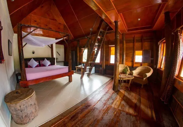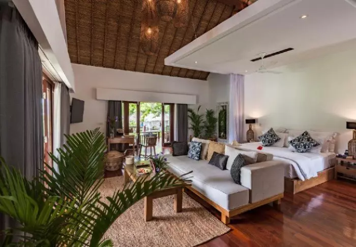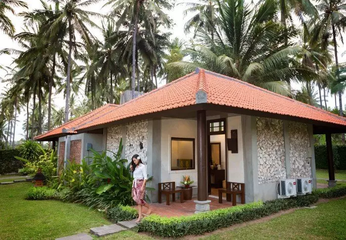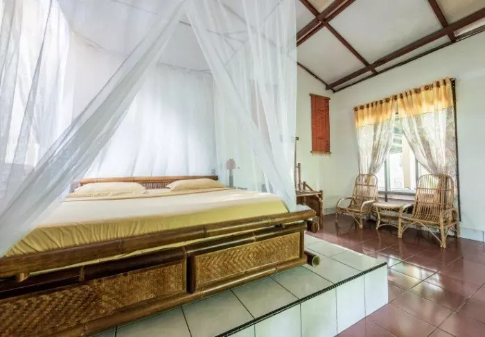 Das Resort ist klein und mit lediglich 11 Zimmern familiär. Diese liegen in traditionellen Bungalows, die in einem blühenden Garten mit hohen Kokospalmen und tropischen Bäumen verteilt sind. Alle Zimmer sind mit WLAN, Klimaanlage, Deckenventilator, Minibar, Safe, Kaffee- und Tee-Ecke, Schminktisch, Tisch und einer Anrichte ausgestattet. Das Bett ist strategisch hervorragend an der großen Fensterfront platziert, sodass Sie die herrlichen Farben des Sonnenaufgangs am Himmel bewundern können, noch bevor Sie überhaupt aufstehen. Die Zimmer haben teilweise Outdoor-Badezimmer mit Regendusche und Föhn. Auf der Terrasse gibt es sowohl Liegestühle als auch einen gemütlichen Sitzbereich.