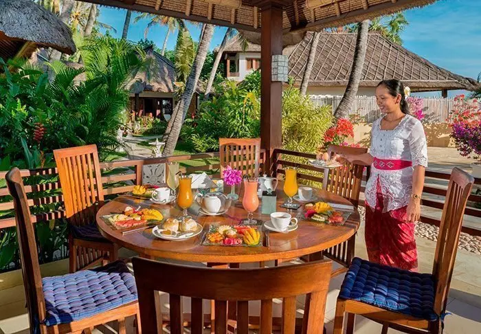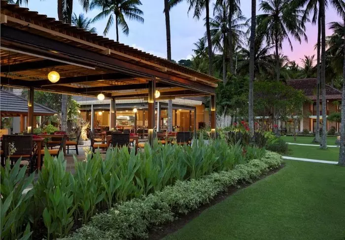Das Hotel besitzt zwei Restaurants, in denen eine Mischung aus indonesischen und westlichen Gerichten, die aus regionalen Zutaten zubereitet werden, serviert wird. Bei Sonnenuntergang können Sie einen Cocktail an der Santi Beach Bar genießen, während Sie auf das glitzernde Meer mit Lombok im Hintergrund blicken.