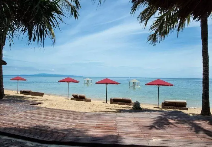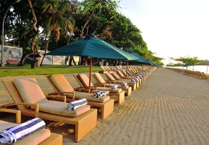 Am Strand können Sie die Liegestühle und Sonnenschirme nutzen. Entspannen Sie sich und genießen Sie die indonesische Wärme.