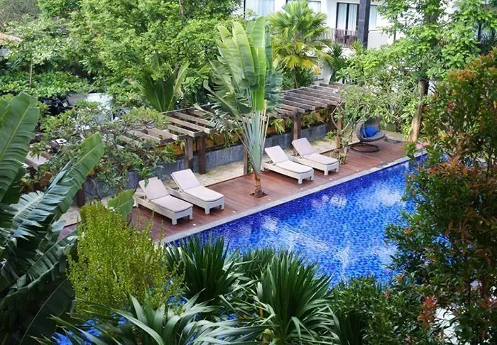 Im Garten befindet sich der Swimmingpool des Hotels, der wie eine kleine Oase zwischen den hohen Bäumen und Palmen auftaucht. Nehmen Sie ein Bad oder entspannen Sie sich einen Moment lang am Beckenrand. Die Stille und die Aussicht sind nämlich zauberhaft.