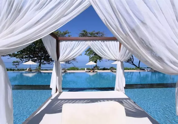 Mitten im 7 Hektar großen Garten liegt der herrliche Infinity-Pool des Hotels. Dort können Sie sich auf den gemütlichen Sonnenliegen rekeln und Snacks sowie kalte Getränke von der Poolbar bestellen. Nach einem langen Tag in der Sonne können Sie im Santi Spa oder in einem der Freiluft-Behandlungsbereiche im Garten Gesichts- und Massageanwendungen genießen.
