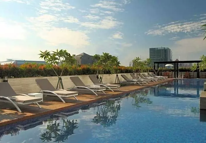 Im Hotel gibt es außerdem einen herrlichen Poolbereich mit Liegestühlen und ein tolles Restaurant mit internationaler Küche.