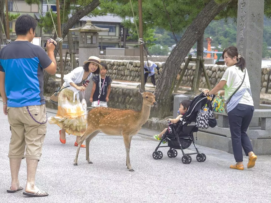 Wir schlagen einen Tagesausflug nach Miyajima vor. Miyajima liegt weniger als eine Stunde von Hiroshima entfernt und ist mit den öffentlichen Verkehrsmitteln ganz einfach erreichbar. Dort befindet sich das knapp 20 Meter hohe weltberühmte rote Tor im Wasser. Bei hohem Wasserstand sieht es aus, als ob es im Wasser schwimmt. Wenn Sie mit der Fähre auf der Insel ankommen, deren eigentlicher Name Itsukushima ist, kommen Sie durch einige Touristenstraßen mit Souvenirläden, kleinen Straßendelikatessläden und Cafés, bevor Sie zu jenem Ort kommen, von wo aus Sie das enorme Tor sehen können. Unterwegs begegnen Ihnen sicher zahme Sikahirsche. Auf der Insel befindet sich auch ein Daisho-in, ein buddhistischer Tempel, der für Besucher geöffnet hat. Ein lustiges Detail ist, dass hier die Buddha-Figuren häufig einen Schal oder eine Mütze tragen. Sie können außerdem mit der Seilbahn zum Gipfel des Berges Misen fahren. Von dort aus haben Sie eine herrliche Aussicht auf Hiroshima und das Binnenmeer mit über 3000 kleinen Inseln.