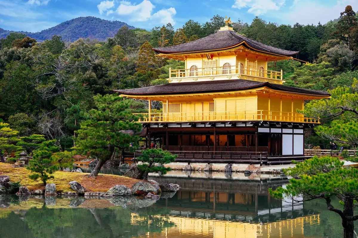 Kyoto beherbergt zahlreiche ikonische Tempel und Schreine. Vielleicht am bekanntesten ist der Goldene Pavillon, Kinkakuji, der anmutig im Teich schimmert, der ihn umgibt. Dieses elegante Bauwerk zählt zu den meistfotografierten Motiven Kyotos und hinterlässt einen unvergesslichen Eindruck – vor allem, wenn Sonnenstrahlen auf seine goldene Fassade tanzen.