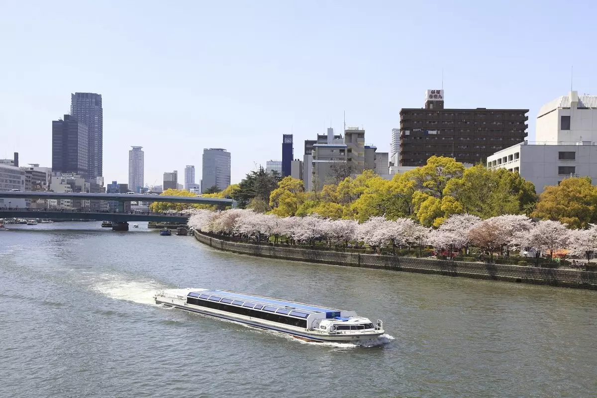 Von der Burg Osaka machen Sie einen kurzen Spaziergang zum Fluss. Dort gehen Sie an Bord eines Aqualiner-Schiffs und können eine Stunde lang Sightseeing auf den Wasserwegen Osakas genießen.